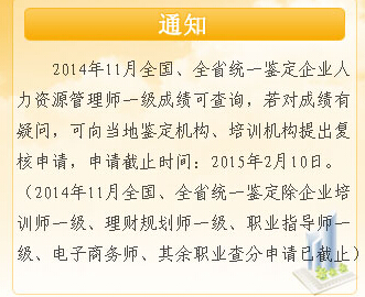 2014年11月全國、全省統一鑒定企業人力資源師一級成績可查詢,若對成績有疑問,可向當地鑒定機構、培訓機構提出復核申請,申請截止時間:2015年2月10日。