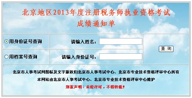 2013年北京地區(qū)注冊稅務(wù)師執(zhí)業(yè)資格考試成績通知單(含合格標(biāo)準(zhǔn))開始查詢,點(diǎn)擊下圖進(jìn)入查詢頁面。