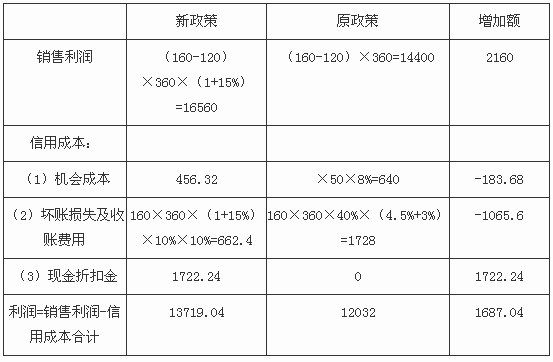 應收賬款現金折扣金額=160×360×(1+15%)×40%×5%+160×360×(1+15%)×30%×2%=1722.24(萬元)。