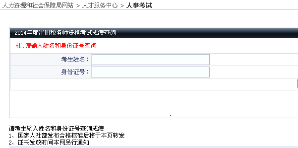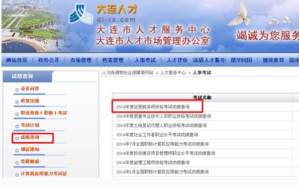 查詢方式:登錄“大連人才”→點擊“人事考試”→成績查詢→2014年度注冊稅務師資格考試成績查詢。
