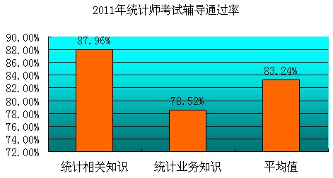 環球網校(www.edu24ol.com)通過對網校學員的回訪及學員的成績反饋,總結出網校2011年統計師考試輔導各科通過率分別為:統計相關知識通過率為87.96%。統計業務知識通過率為78.52%,平均通過率為83.24%。