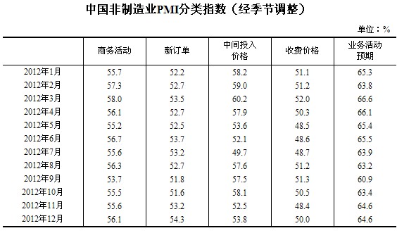 2012年12月,中國非制造業商務活動指數為56.1%,比上月上升0.5個百分點。