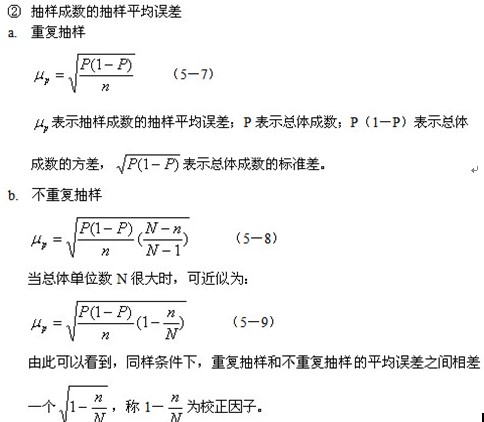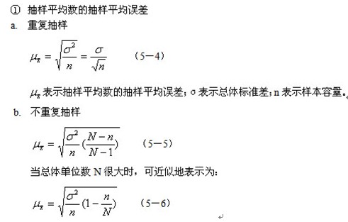 抽樣推斷的兩個主要目的:以樣本平均數推斷總體平均數,以樣本成數推斷總體成數。同時,在簡單隨機抽樣時又有重復抽樣和不重復抽樣的兩種取樣方法。這樣,抽樣平均誤差也因此有如下度量的公式: