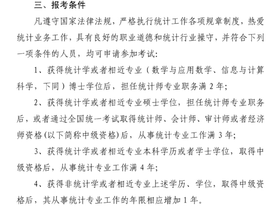 凡遵守國家法律法規,嚴格執行統計工作各項規章制度,熱愛統計業務工作,具有良好的職業道德和統計行業操守,并符合下列一項條件的人員,均可申請參加考試:
