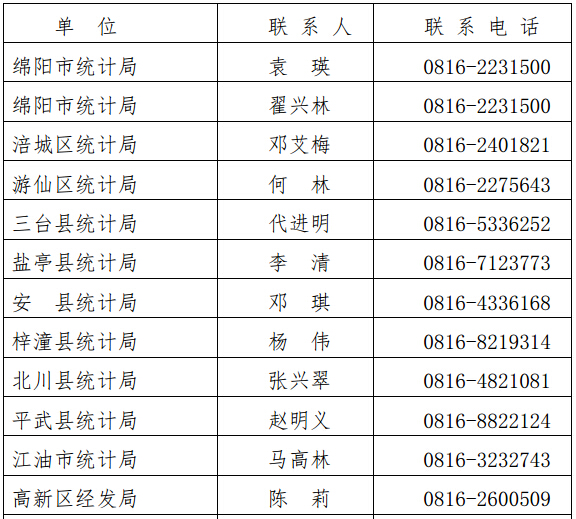 各縣(市、區)統計局、園區經發(科經)局、市級各部門、企事業單位、科學城辦事處統計局、綿陽職業技術學院: