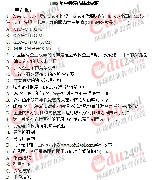2008年經(jīng)濟師考試已于11月1日結(jié)束,環(huán)球網(wǎng)校及時整理了2008年經(jīng)濟師考試真題和答案,歡迎廣大考生核對考試答案,敬請廣大經(jīng)濟師考生關(guān)注。以下是中級經(jīng)濟師經(jīng)濟基礎(chǔ)考試真題: