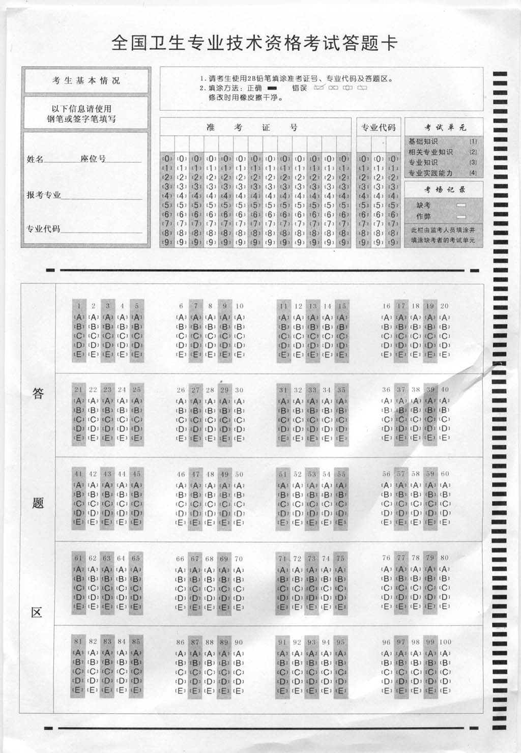 2009年衛生專業技術資格考試時間為5月9、10、16、17日,衛生專業技術資格考試答題卡如圖: