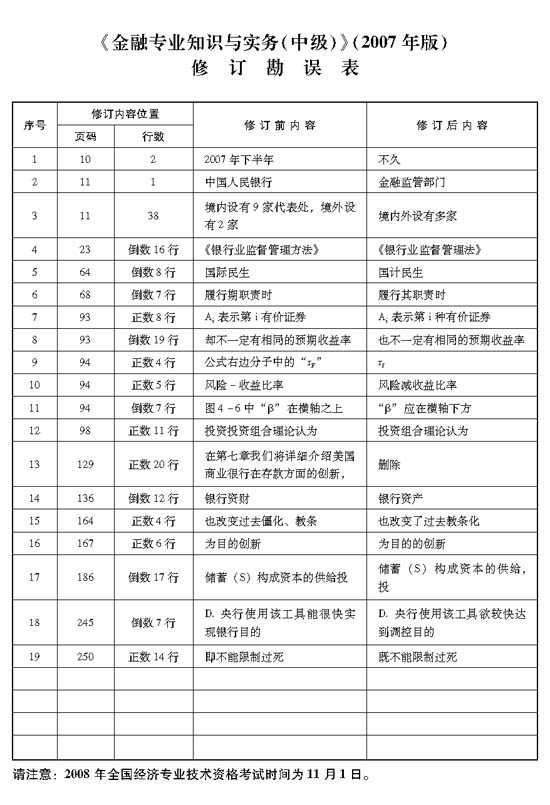 2008 年度全國經濟專業技術資格考試時間定于11 月1 日。人事部人事考試中心根據社會經濟發展和相關法規出臺的實際情況,針對2007 年版考試用書編校和印制中出現的問題,2008 年經濟考試用書做部分調整。其中,工商管理等9 個專業和經濟基礎知識共20 種考試用書采取勘誤的方式進行修訂(點擊查看人事考試中心通知原文件)。以下為中國人事出版社《金融專業知識與實務(中級)》(2007年版)教材勘誤內容: