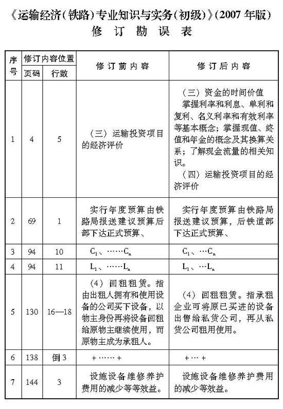 2008 年度全國經濟專業技術資格考試時間定于11 月1 日。人事部人事考試中心根據社會經濟發展和相關法規出臺的實際情況,針對2007 年版考試用書編校和印制中出現的問題,2008 年經濟考試用書做部分調整。其中,工商管理等9 個專業和經濟基礎知識共20 種考試用書采取勘誤的方式進行修訂(點擊查看人事考試中心通知原文件)。以下為中國人事出版社《運輸經濟(鐵路)專業知識與實務(初級)》(2007年版)教材勘誤內容: