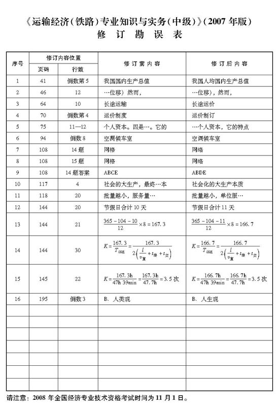 2008 年度全國經(jīng)濟(jì)專業(yè)技術(shù)資格考試時間定于11 月1 日。人事部人事考試中心根據(jù)社會經(jīng)濟(jì)發(fā)展和相關(guān)法規(guī)出臺的實際情況,針對2007 年版考試用書編校和印制中出現(xiàn)的問題,2008 年經(jīng)濟(jì)考試用書做部分調(diào)整。其中,工商管理等9 個專業(yè)和經(jīng)濟(jì)基礎(chǔ)知識共20 種考試用書采取勘誤的方式進(jìn)行修訂(點擊查看人事考試中心通知原文件)。以下為中國人事出版社《運(yùn)輸經(jīng)濟(jì)(鐵路)專業(yè)知識與實務(wù)(中級)》(2007年版)教材勘誤內(nèi)容: