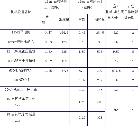 注:假定基層施工期為6個(gè)月,每月工作日22天,機(jī)械設(shè)備幅度差1.43(指施工產(chǎn)量定額換算為預(yù)算定額的幅度差);廠拌法施工所需穩(wěn)定土廠拌設(shè)備安裝、拆除以及場(chǎng)地清理、平整、墊層、碾壓不包括在內(nèi)。