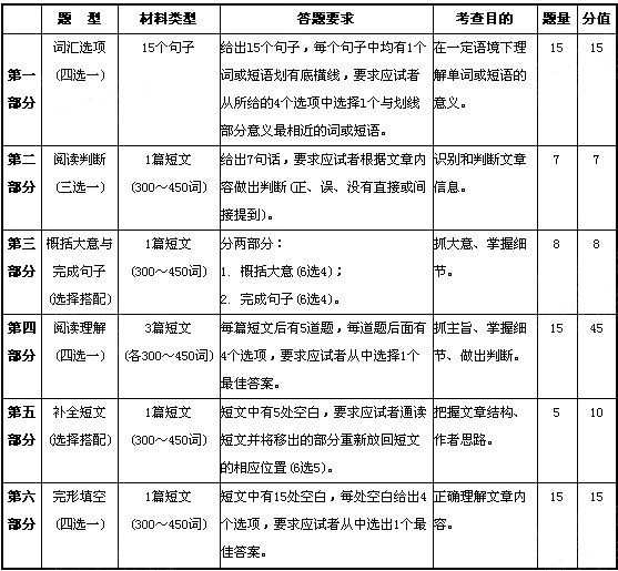 A、B、C三個等級的考試各由6個部分組成,每個級別的考試題型一樣、題量相同,但不同級別考試總的閱讀量及難易程度不同。考試主要考查應試者理解書面英語的能力。