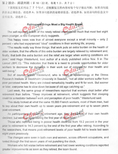 當前位置: 首頁 > 職稱英語 > 職稱英語歷年試題 > 2010年職稱英語真題之衛生類A級閱讀判斷
