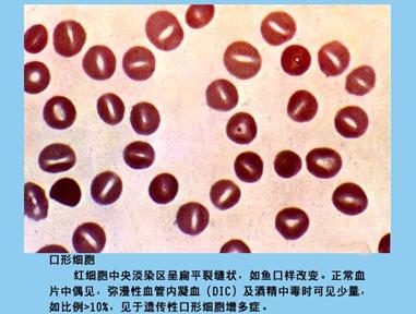 紅細胞中央有裂縫,中心蒼白區呈扁平狀,頗似張開的口形或魚口。在正常人偶見如積壓涂片中出現較多口形紅細胞,見于口形紅細胞增多癥。少量出現可見于彌漫性血管內凝血、酒清中毒。