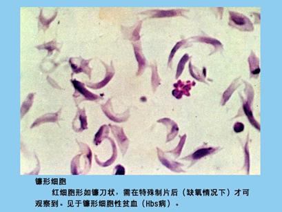 鐮形紅細胞形如鐮刀狀。這是由于紅細胞內存在著異常血紅蛋白S所致,在缺氧情況下尤易形成此尖紅細胞。因此檢查鐮形紅細胞需將血液制成濕片,然后加入還原劑如偏亞硫酸。