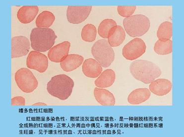 屬于尚未完全成熟的紅細胞,細胞較大,由于胞漿中含有多少不等的嗜堿性物質(zhì)RNA而被染成灰藍色。見于白血病、溶血性貧血。
