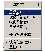 排列窗口:除了用移動改變窗口大小的方式排列窗口外,還可以用命令的方式來排列窗口。方法是,在任務(wù)欄空白處單擊鼠標右鍵,將打開一個快捷菜單,菜單中提供的所有窗口排列命令。