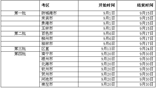 (二)全區網上報名注冊開通的時間為2010年 9月1日起至9月30日止,每天報名時間自上午6時起至晚上10時止(北京時間),逾期不再辦理。各個考區報名時間請仔細參閱下表: