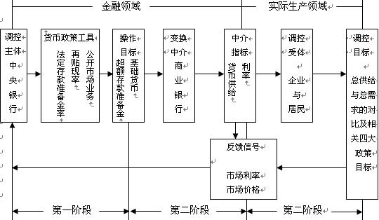 中央銀行通過提高或降低商業銀行法定存款準備金比率,提高或降低商業銀行向中央銀行票據貼現的再貼現率,在金融市場上公開賣出和買人證券等來實施緊縮或寬松的貨幣政策,調控基礎貨幣和市場利率,影響商業銀行的和金融市場的行為與態勢,間接調控貨幣供給量,從而改變企業與住戶的貨幣需求預期,調整社會投資與消費的關系,以實現貨幣政策目標。