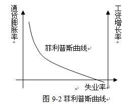 澳大利亞著名經濟學家菲利普斯通過研究1861--1957近100年英國的失業率與物價變動的關系,得出了結論:失業率與物價上漲之間,存在著一種此消彼長的關系。這一關系可用圖9-2來表示。