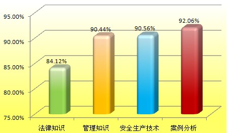 環(huán)球網(wǎng)校(www.edu24ol.com)通過(guò)對(duì)網(wǎng)校學(xué)員的回訪及學(xué)員的成績(jī)反饋進(jìn)行統(tǒng)計(jì),得出網(wǎng)校2010年安全工程師考試輔導(dǎo)各科通過(guò)率分別為:《安全生產(chǎn)法及相關(guān)法律知識(shí)》84.12%、《安全生產(chǎn)管理知識(shí)》90.44%、《安全生產(chǎn)技術(shù)》90.56%、《安全生產(chǎn)事故案例分析》92.06%。