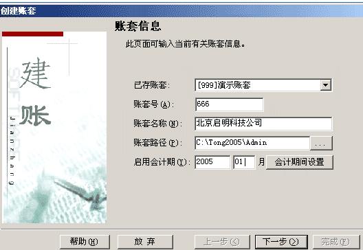3.賬套路徑:用來輸入新建賬套將要被放置的路徑。如“C:\Tong2005\Admin”