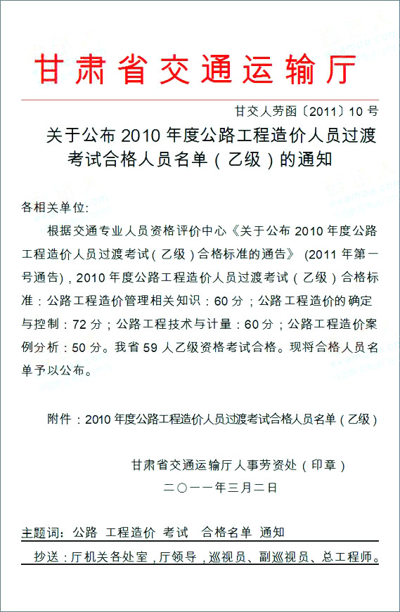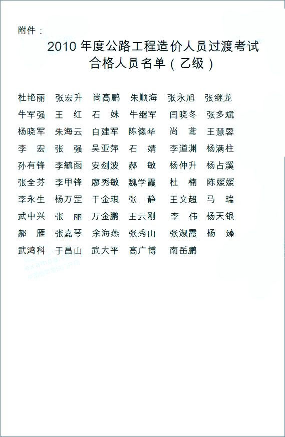 甘肅2010公路工程造價人員過渡考試(乙級)合格人員名單
