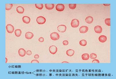 直徑小于6μ m者稱為小紅細胞,正常人偶見。提示血紅蛋白合成障礙,可能由于缺鐵和珠蛋白代謝異常所致。見于缺鐵性貧血和珠蛋白生成障礙性貧血。