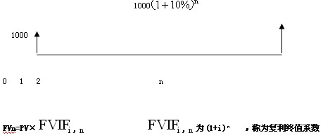 例如,將1000元存入銀行,年利率為10%,一年以后的復(fù)利終值為1000(1+10%);兩年以后的復(fù)利終值為1000(1+10%)(1+10%);三年以后的復(fù)利終值為1000(1+10%)(1+10%)(1+10%)……………n年以后的復(fù)利終值為1000(1+10%)ⁿ