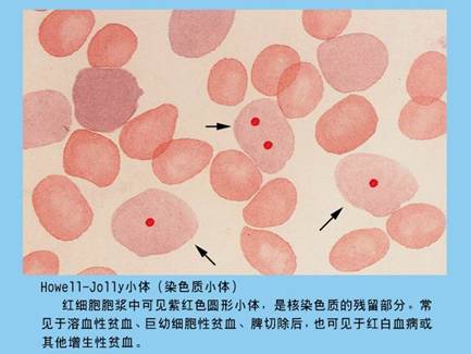 位于成熟或幼紅細胞的胞漿中,圓形,1-2um,紫色,為核殘余物,