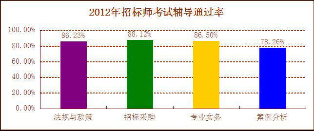 環球網校(www.edu24ol.com)通過對網校學員的回訪及學員的成績反饋進行統計,得出網校2012年招標師考試輔導各科通過率分別為:招標采購法律法規與政策通過率為86.23%、項目管理與招標采購通過率為88.12%、招標采購專業實務通過率為86.50%、招標采購案例分析通過率為78.26%;2012年全科輔導通過率為59.57%。