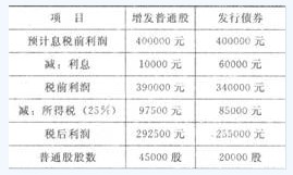 某公司因生產(chǎn)發(fā)展需要再籌資50萬元。現(xiàn)有兩種籌資方案可供選擇:(1)增發(fā)25000股普通股,每股發(fā)行價為20元;(2)發(fā)行債券50萬元,債券年利率10%。公司的息稅前利潤目標(biāo)為40萬元,所得稅率為25%,該公司籌資后的利潤狀況見下表: