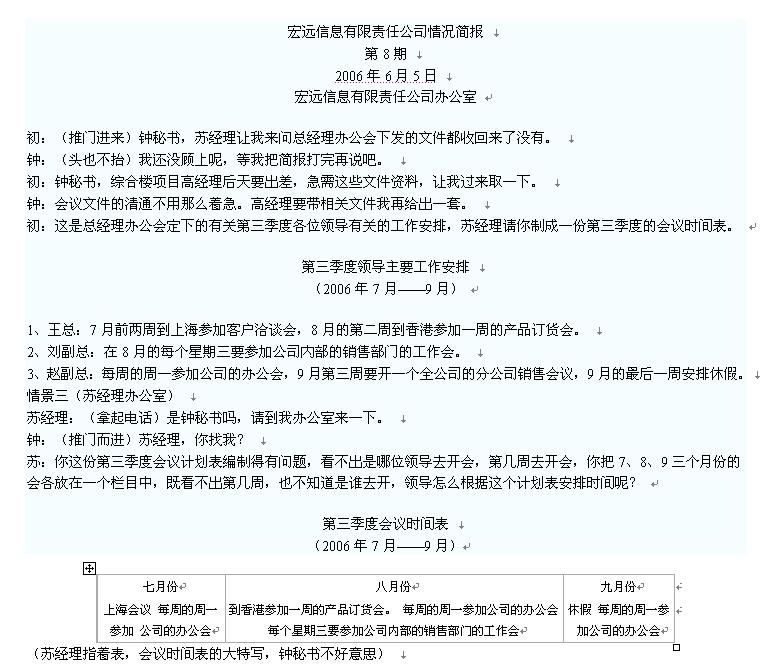 鐘:(對初萌)今天的總經理辦公會將重點討論綜合樓項目的資金籌措問題,你幫助檢查一下,錄音機和磁帶準備好了沒有。還有我來公司時間不長,認識的人不多,請你把出席人員的座位圖給我出一份。