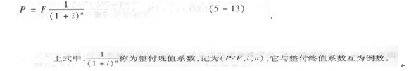 如果已知的是終值F,需要求現值P,則實際上就是公式(5―12)的逆運算。整付現值公式為: