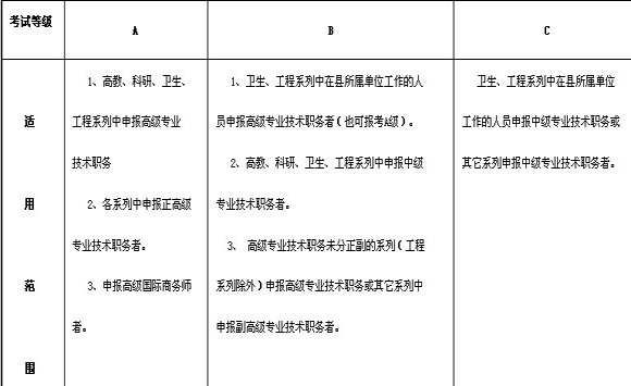 考試等級按不同系列、不同檔次、不同地區劃分為A、B、C三個等級,適用人員見下表: