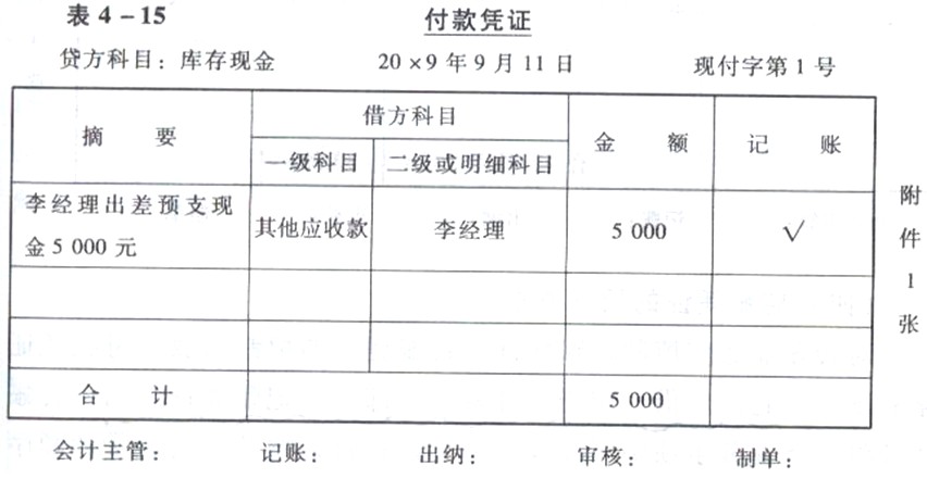 經(jīng)濟(jì)業(yè)務(wù):2009年9月11日李經(jīng)理出差預(yù)借差旅費(fèi)5000元,以現(xiàn)金支付。分錄如下: