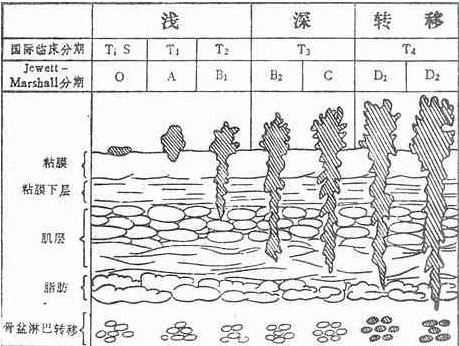 膀胱腫瘤大多來源于上皮細(xì)胞,占95%以上,而其中90%以上為移行細(xì)胞癌,鱗狀細(xì)胞癌和腺癌較少見,但惡性程度遠(yuǎn)較移行細(xì)胞癌為高。非上皮來源的腫瘤如橫紋肌肉瘤等則罕見。膀胱腫瘤在病理改變上根據(jù)細(xì)胞大小、形態(tài)、染色深淺、核改變、分裂相等分為四級。一、二級分化較好,屬低度惡性;三、四級分化不良,屬高度惡性。乳頭狀瘤細(xì)胞形態(tài)與正常移行細(xì)胞無明顯差異,但有復(fù)發(fā)和惡變傾向,因此在治療上仍視為癌腫對待。膀胱腫瘤在生長方式上,有原位癌、乳頭狀癌和浸潤性癌三種,在臨床上三者混合性存在不很少見。在膀胱鏡下或活體標(biāo)本大體觀察可以看出腫瘤有蒂者常為低度惡性,廣基無蒂者為高度惡性,潰瘍浸潤型的腫瘤總是高度惡性的。臨床上對膀胱腫瘤生長浸潤深度按Jewett-Marshall分期方法分為四期(圖6-31)。