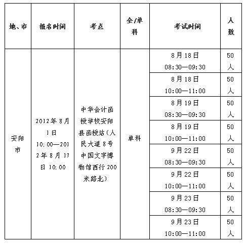 安陽市2012年度第三季度第三期會計從業資格無紙化考試(補報)計劃