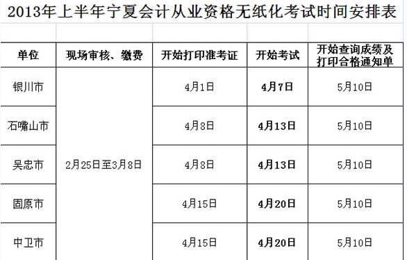 附件:2013年上半年寧夏會(huì)計(jì)從業(yè)資格無(wú)紙化考試時(shí)間安排表