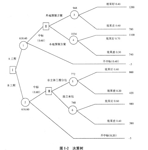 因為點①的期望值最大,故應參加A工程的投標,且選用本地預制方案。