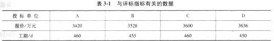 某公開招標(biāo)項(xiàng)目,現(xiàn)有A、B、C、D四家經(jīng)資格審查合格的施工企業(yè)參加該工程投標(biāo),與評標(biāo)指標(biāo)有關(guān)的數(shù)據(jù)見表3-1。