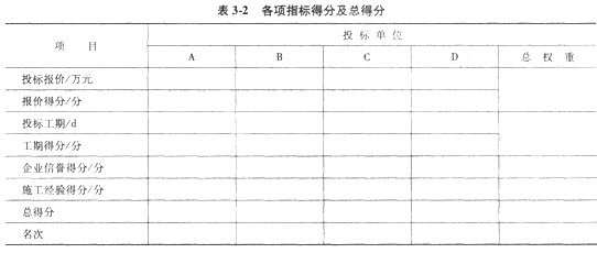 (1)報(bào)價(jià)以在標(biāo)底價(jià)(3600萬元)的(1±3%)以內(nèi)為有效標(biāo)。評分方法:報(bào)價(jià)以標(biāo)底價(jià)減去其3%為100分,在標(biāo)底價(jià)減去其3%的基礎(chǔ)上,每上升1%扣5分。(2)定額工期為500d。評分方法:工期提前10%為100分,在此基礎(chǔ)上每拖后5d扣2分。(3)企業(yè)信譽(yù)和施工經(jīng)驗(yàn)均已在資格審查時(shí)評定。企業(yè)信譽(yù)得分:C單位為100分,A、B、D單位均為95分;施工經(jīng)驗(yàn)得分:A、B單位為100分,C、D單位為95分。(4)上述四項(xiàng)評標(biāo)指標(biāo)的總權(quán)重:投標(biāo)報(bào)價(jià)45%,投標(biāo)工期25%,企業(yè)信譽(yù)和施工經(jīng)驗(yàn)均為15%。問題試在表3-2中填制每個投標(biāo)單位各項(xiàng)指標(biāo)得分及總得分。其中報(bào)價(jià)得分要求列出計(jì)算式。請根據(jù)總得分列出名次并確定中標(biāo)單位。