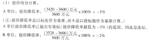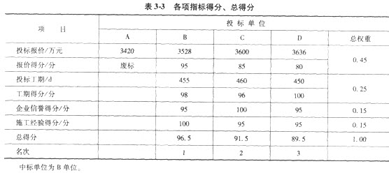 與報(bào)價(jià)降低率-3%相比,上升1%,扣5分。因此B單位報(bào)價(jià)得分為95分。同理可求出C單位、D單位報(bào)價(jià)得分分別為85分、80分。