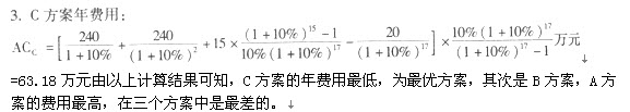 =63.18萬元由以上計算結果可知,C方案的年費用最低,為最優(yōu)方案,其次是B方案,A方案的費用最高,在三個方案中是最差的。