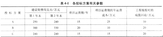 3.假設該工程有效標書經評標老師的評審,其中A、B、C三家投標單位投標方案的有關參數見表4-1。