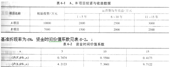 某總承包企業(yè)擬開拓國內(nèi)某大城市工程承包市場(chǎng)。經(jīng)調(diào)查該市目前有A、B兩個(gè)BOT項(xiàng)目將要招標(biāo)。兩個(gè)項(xiàng)目建成后經(jīng)營期限均為15年。為了順利進(jìn)行投標(biāo),企業(yè)經(jīng)營部將在該市投標(biāo)全過程按先后順序分解為以下幾項(xiàng)工作:①投標(biāo)申請(qǐng);②接受資格審查;③領(lǐng)取招標(biāo)文件;④參加投標(biāo)預(yù)備會(huì);⑤參加現(xiàn)場(chǎng)踏勘;⑥編制投標(biāo)文件;⑦編制項(xiàng)目可行性研究論證報(bào)告;⑧投送投標(biāo)文件;⑨投標(biāo)文件內(nèi)容說明與陳述;參加開標(biāo)會(huì)議;⑨簽訂合同。經(jīng)進(jìn)一步調(diào)研,收集和整理出A、B兩個(gè)項(xiàng)目投資與收益數(shù)據(jù),見表6-1。