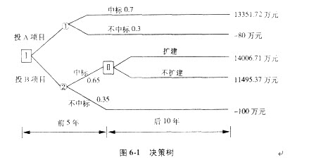 2.不考慮建設(shè)期的影響,分別列式計(jì)算A、B兩個(gè)項(xiàng)目總收益的凈現(xiàn)值。據(jù)估計(jì):投A項(xiàng)目中標(biāo)概率為0.7,不中標(biāo)費(fèi)用損失80萬元;投B項(xiàng)目中標(biāo)概率為0.65不中標(biāo)費(fèi)用損失100萬元。若投B項(xiàng)目中標(biāo)并建成經(jīng)營5年后,可以自行決定是否擴(kuò)擴(kuò)建,其擴(kuò)建投資4000萬元,擴(kuò)建后B項(xiàng)目每年運(yùn)營收益增加1000萬元。按以下步驟求解該問題: