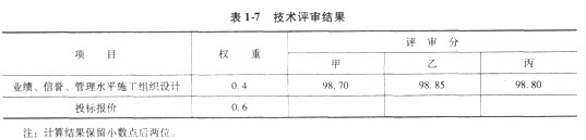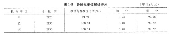 3.評標委員會對甲、乙、丙三家投標單位的技術標評審結果見表1-7。評標辦法規定:各投標單位報價比標底價每下降1%,扣1分,最多扣10分;報價比標底價每增加1%,扣2分,扣分不保底。報價與標底價差額在1%以內時可按比例平均扣減。評標時不考慮資金時間價值。設標底價為2125萬元,根據得分最高者中標原則,試確定中標單位。