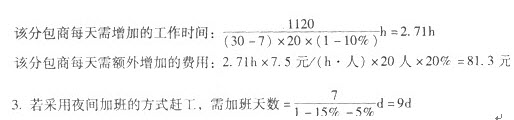 5.(1)采取每天延長工作時間的方式趕工,需額外增加費用共81.3元/d×23d=1869.9元。(2)采取夜間加班方式趕工,需額外增加費用共460元/d×9d=4140元。(3)因為兩種趕工方式所需增加的費用均小于逾期違約金1000元/d×7d=7000元。所以該分包商應采取趕工措施。因采取延長工作時間方式費用最低,所以采取每天延長工作時間的方式趕工。