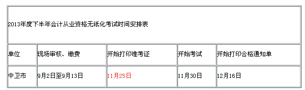 2013年下半年中衛(wèi)會計從業(yè)資格考試準考證打印時間11月25日起